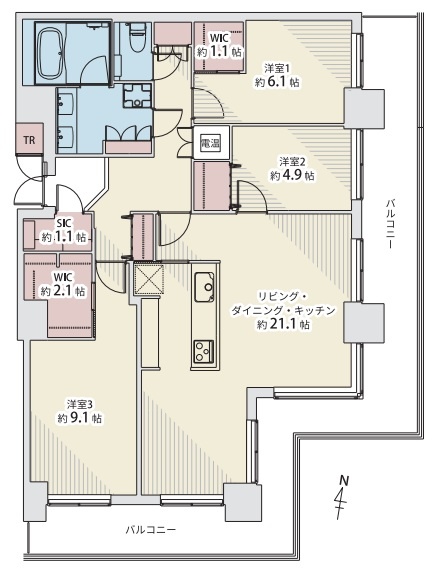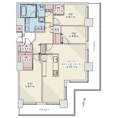 3LDK(104.5m²)└ LDK21.1帖 洋室9.1帖 洋室6.1帖 洋室4.9帖