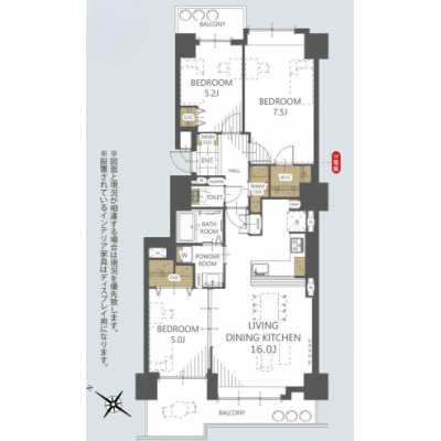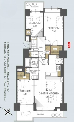 3LDK(75.3m²)└ 洋室7.5帖 洋室5.2帖 洋室5帖 LDK16帖