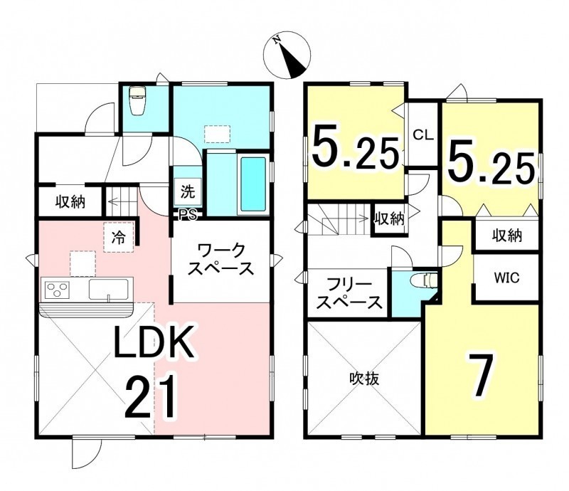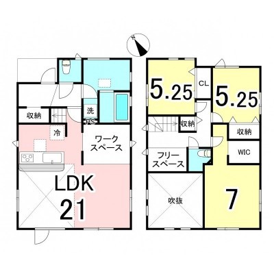 | 間取り | 3LDK1階:LDK21帖 / 2階:洋室5.25帖 洋室5.25帖 洋室7帖 |