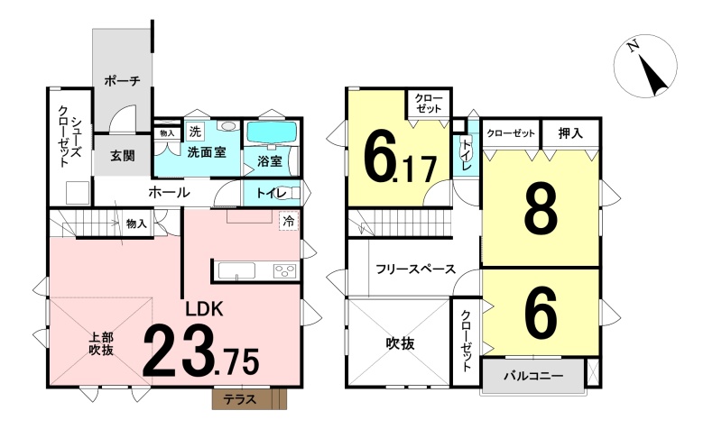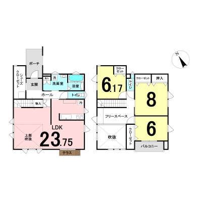 | 間取り | 3LDK1階:LDK23.75帖 / 2階:洋室8帖 洋室6.1帖 洋室6帖 |