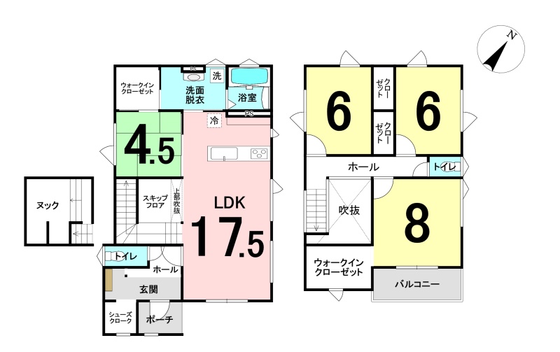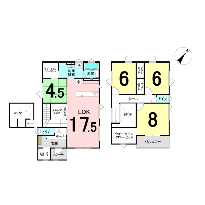 | 間取り | 4LDK1階:LDK17.5帖 和室4.5帖 / 2階:洋室8帖 洋室6帖 洋室6帖 |