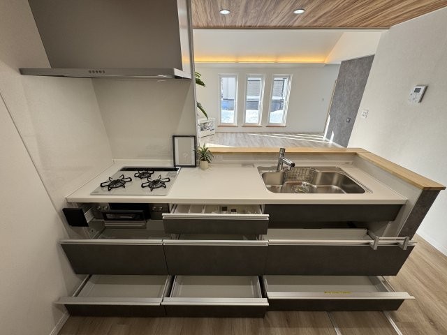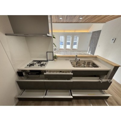 収納力も◎。コンロやフードなど全部新品です。