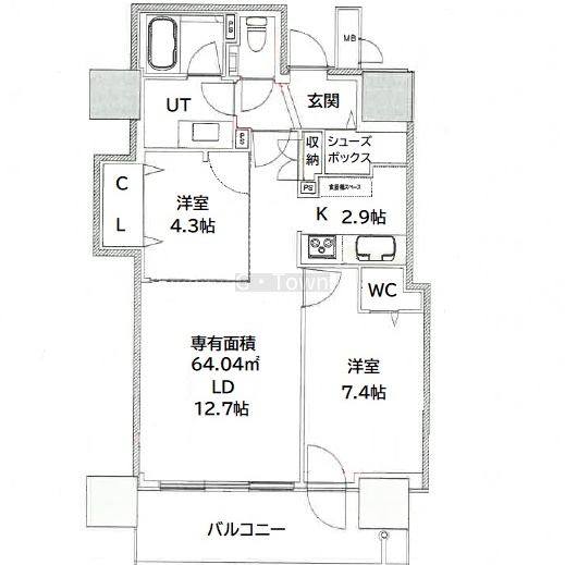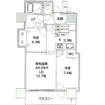 2LDK(64.04m²)└ 10階:LD12.7帖 / その他:洋室4.3帖 洋室7.4帖 K2.9帖