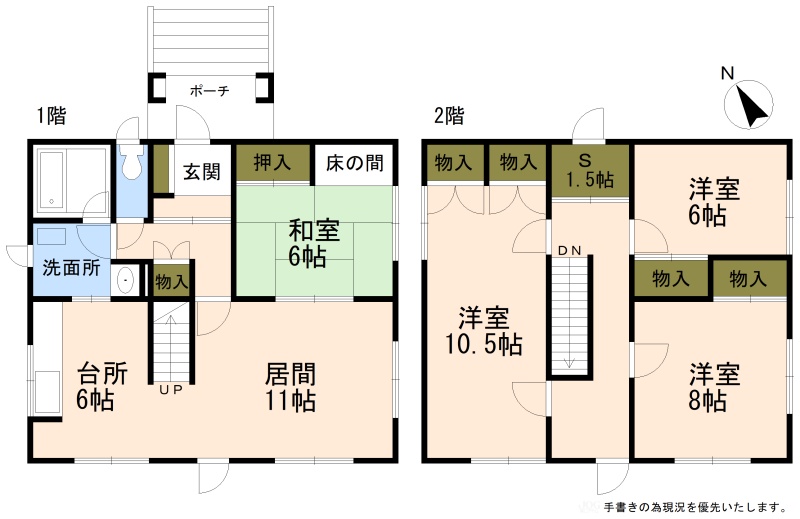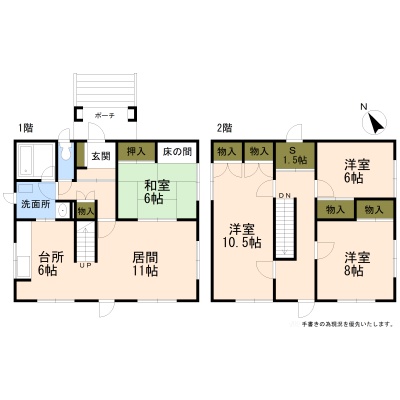 | 間取り | 4LDK1階:LDK17帖 和室6帖 / 2階:洋室10.5帖 洋室8帖 洋室6帖 S1.5帖 |