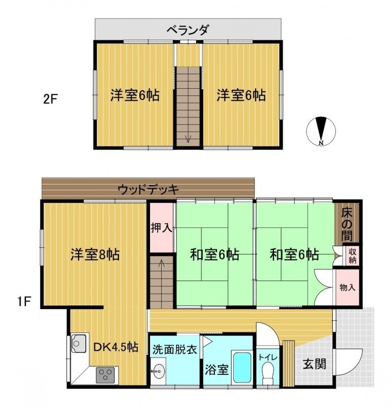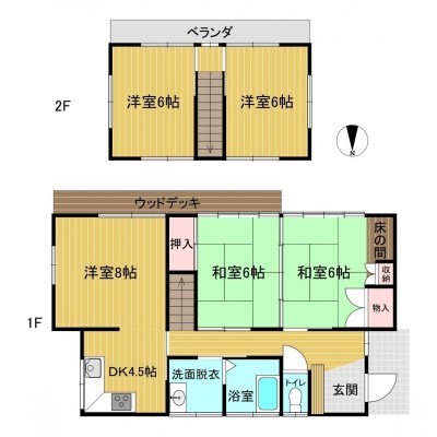 | 間取り | 5DK1階:和室6帖 和室6帖 洋室8帖 DK4.5帖 / 2階:洋室6帖 洋室6帖 |