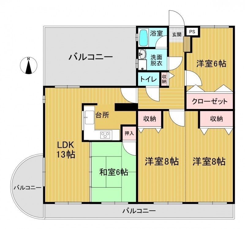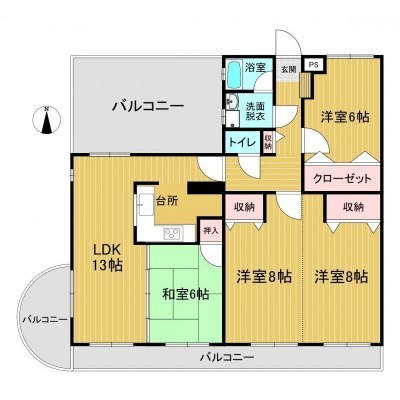 4LDK(96.01m²)└ 8階:LDK13帖 洋室8帖 洋室8帖 洋室6帖 和室6帖
