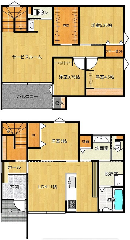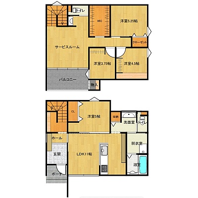 | 間取り | 4SLDK1階:LDK11帖 洋室5帖 / 2階:洋室5.2帖 洋室4.5帖 洋室3.7帖 S9帖 |
