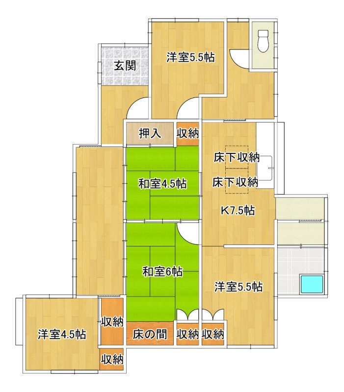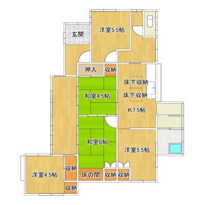 | 間取り | 5DK1階:DK7.5帖 洋室5.5帖 洋室5.5帖 洋室4.5帖 和室6帖 和室4.5帖 |