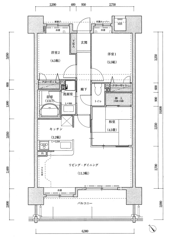 3LDK(63m²)└ 洋室5.5帖 洋室4.5帖 和室4.5帖 LDK14.5帖