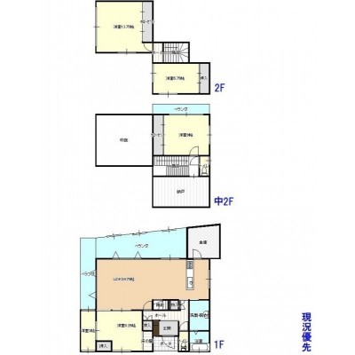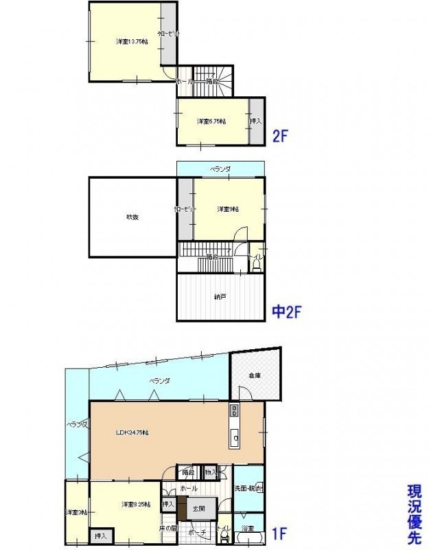 | 間取り | 4LDK1階:洋室8.25帖 LDK24.75帖 / 2階:洋室9帖 S / 3階:洋室13.75帖 洋室6.75帖 |