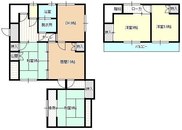 | 間取り | 5DK1階:和室6帖 和室6帖 洋室7.5帖 DK6帖 / 2階:洋室6帖 洋室5.5帖 |