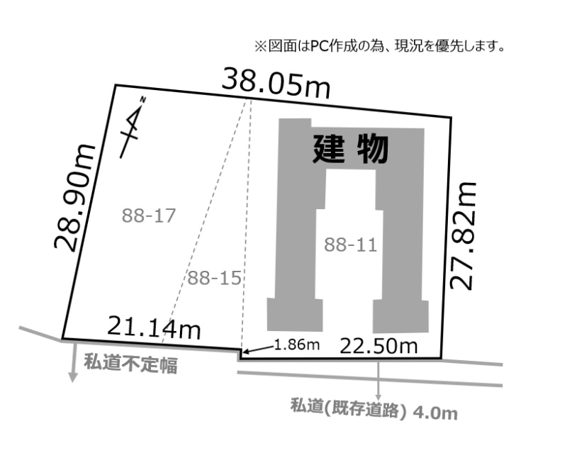 接道状況 一方 - 南側幅4.00mの私道に43.64m接道