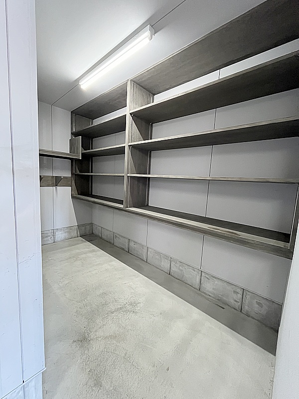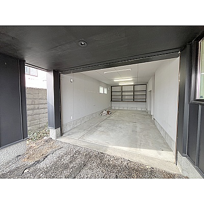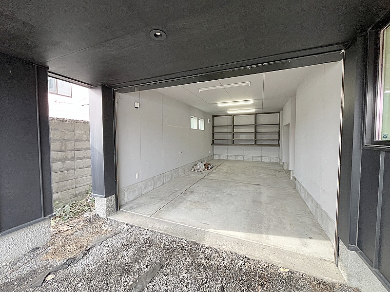 車庫内も収納棚がたくさん!奥には4帖の物置付き!