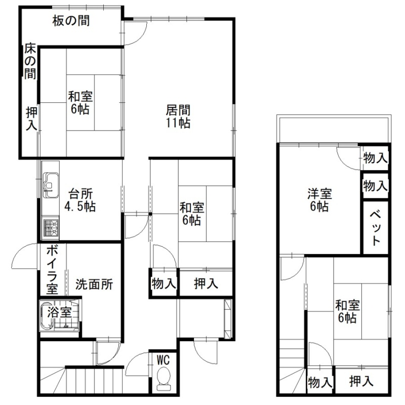 | 間取り | 4LDK1階:LD11帖 和室6帖 和室6帖 / 2階:洋室6帖 和室6帖 |
