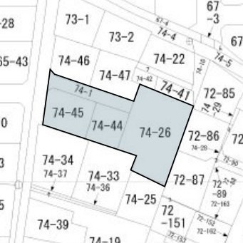 備考 現況有姿・境界明示 土地面積857㎡の内、有効面積742㎡(224.45坪)物件通路部分(地番74-1)は隣接の土地所有者も通行致します。 現在ガスは使用しておりませんが都市ガスは利用可(工事は買主負担) 駐車場は通路部分に駐車可。(縦列3台程度) 学区色がついているアイコンをクリックすると、本物件までの道順を見ることができます。