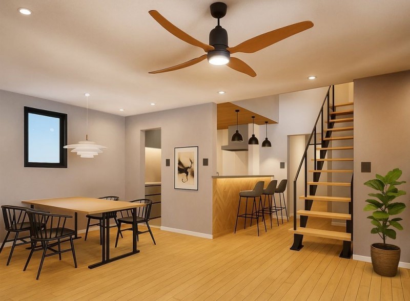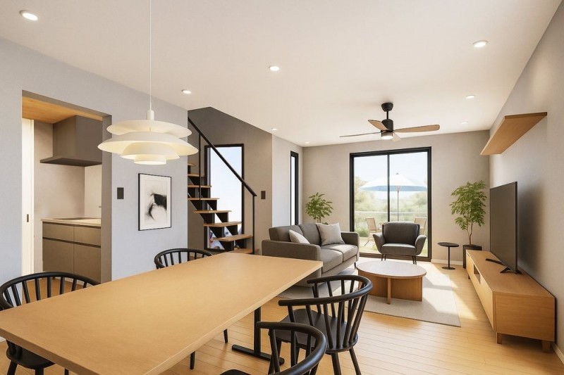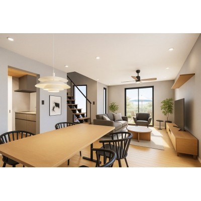 完成予想図(カフェカウンターとスケルトン階段が魅力のキッチ…