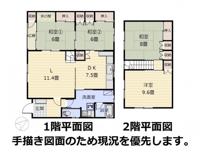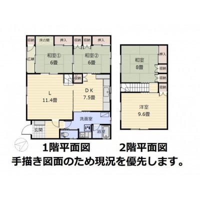 | 間取り | 4LDK1階:L11.4帖 DK7.5帖 和室6帖 和室6帖 / 2階:和室8帖 洋室9.6帖 |