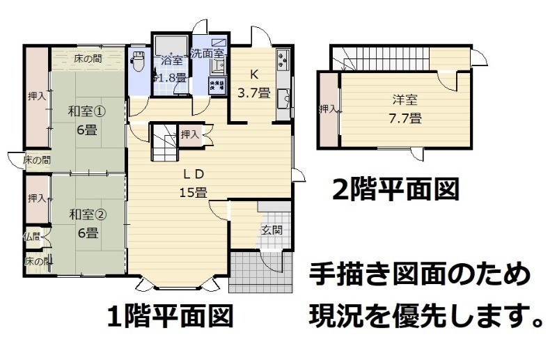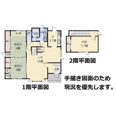 | 間取り | 3LDK1階:LD15帖 K3.7帖 和室6帖 和室6帖 / 2階:洋室7.7帖 |