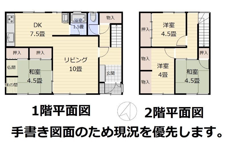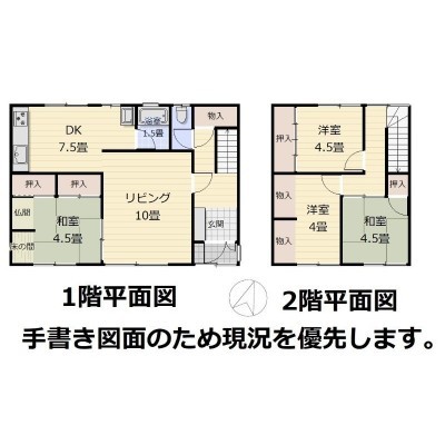 | 間取り | 4LDK1階:L10帖 DK7.5帖 和室4.5帖 / 2階:和室4.5帖 洋室4帖 洋室4.5帖 |