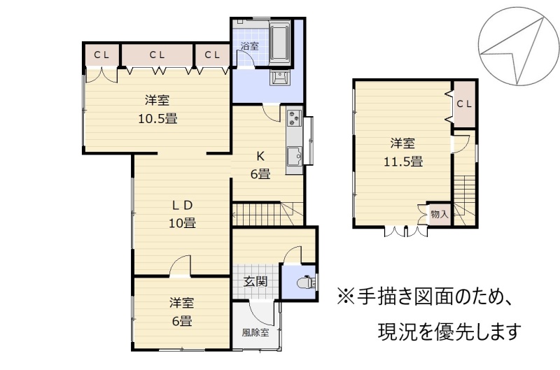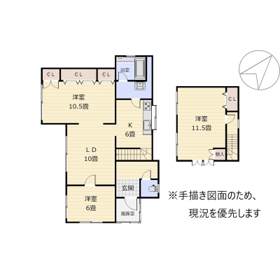 | 間取り | 3LDK1階:LD10帖 K6帖 洋室10.5帖 洋室6帖 / 2階:洋室11.5帖 |