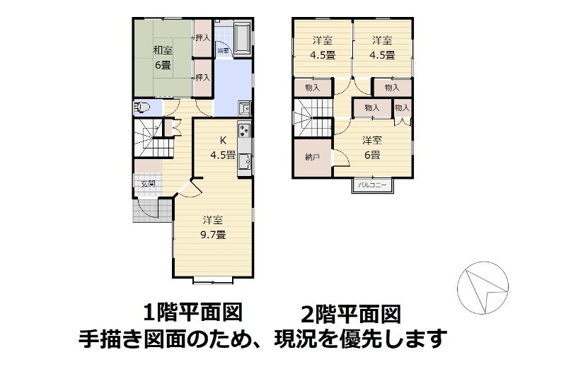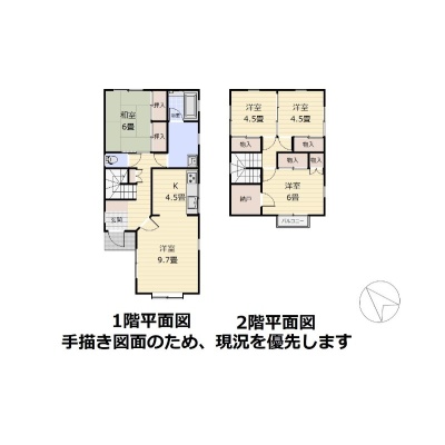 | 間取り | 4LDK1階:LD9.7帖 K4.5帖 和室6帖 / 2階:洋室4.5帖 洋室4.5帖 洋室6帖 |