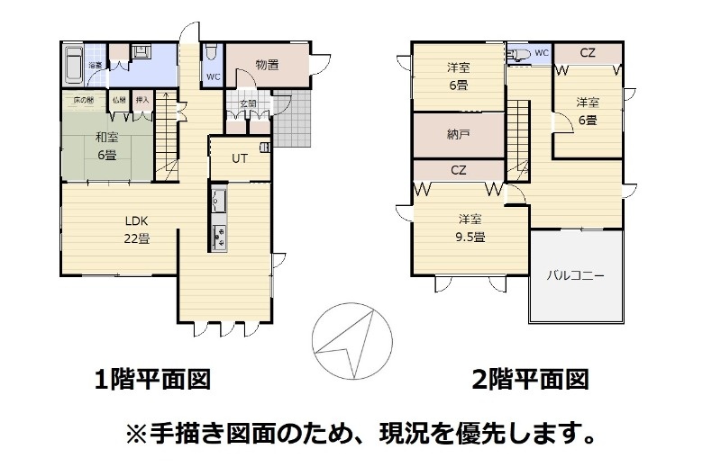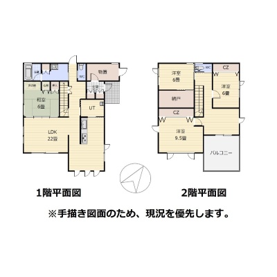 | 間取り | 4LDK1階:LDK22帖 和室6帖 / 2階:洋室9.5帖 洋室6帖 洋室6帖 |