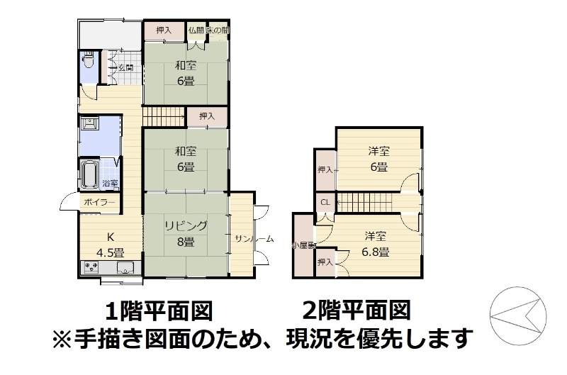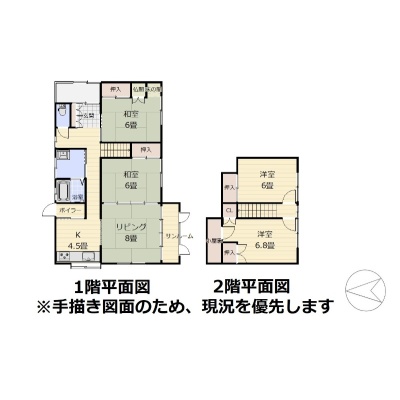 | 間取り | 4LDK1階:LD8帖 K4.5帖 和室6帖 和室6帖 / 2階:洋室6帖 洋室6帖 |