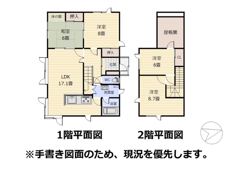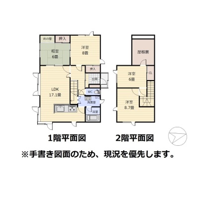 | 間取り | 4LDK1階:LDK17.1帖 和室6帖 洋室8帖 / 2階:洋室8.7帖 洋室6帖 |