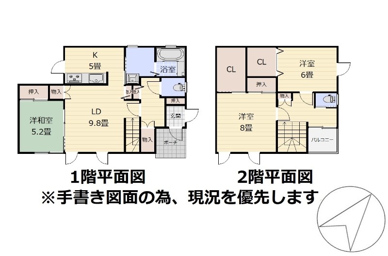 | 間取り | 3LDK1階:LDK14.8帖 その他5.2帖 / 2階:洋室8帖 洋室6帖 |