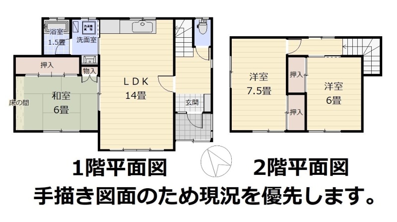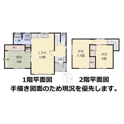 | 間取り | 3LDK1階:LDK14帖 和室6帖 / 2階:洋室7.5帖 洋室6帖 |