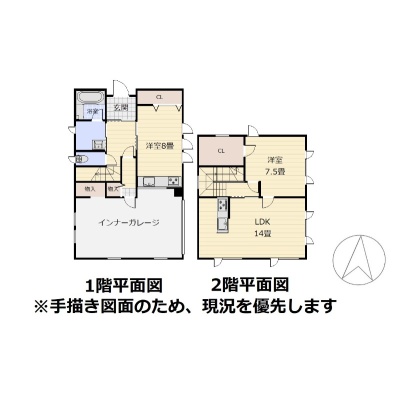 | 間取り | 2LDK1階:洋室8帖 / 2階:LDK14帖 洋室7.5帖 |