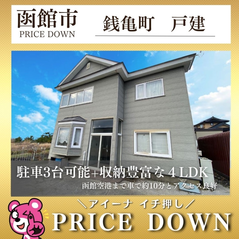 ここに注目!☆お値下げしました☆小学校まで徒歩2分、土地69坪のゆとりある4LDK住宅。海沿いの静かな住環境に建ち、主要採光面は南向きで陽当たり良好です。全居室収納付きで荷物もすっきり片付き、車庫を含めて3台分の駐車スペースも確保。バス停まで徒歩5分で通勤・通学にも便利。函館空港まで車で約10分とアクセス良好で、落ち着いた暮らしと利便性を両立できる住まいです。 土日祝日はもちろん、お仕事帰りの見学も大歓迎です♪ 写真とは違う実際の物件をぜひご覧ください。 弊社は建設業許可を受けておりますのでリフォーム等のご相談もご安心ください。 税金や銀行融資関係等の資金の提案もお引渡しまで全面的にサポートさせて頂きます。