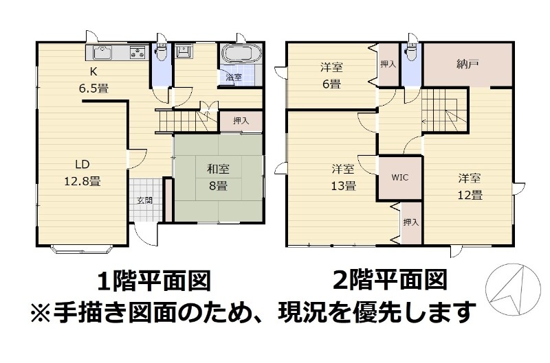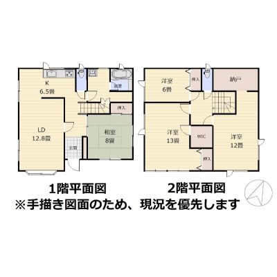 | 間取り | 4LDK1階:LD12.8帖 K6.5帖 和室8帖 / 2階:洋室6帖 洋室13帖 洋室12帖 |