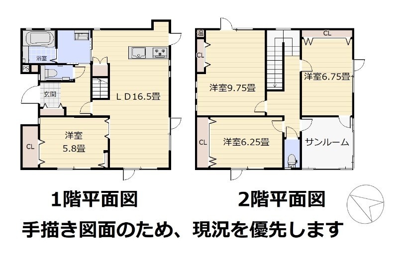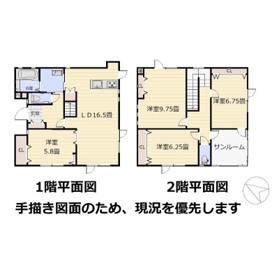 | 間取り | 4LDK1階:LDK16.5帖 洋室5.8帖 / 2階:洋室9.75帖 洋室6.25帖 洋室6.75帖 |