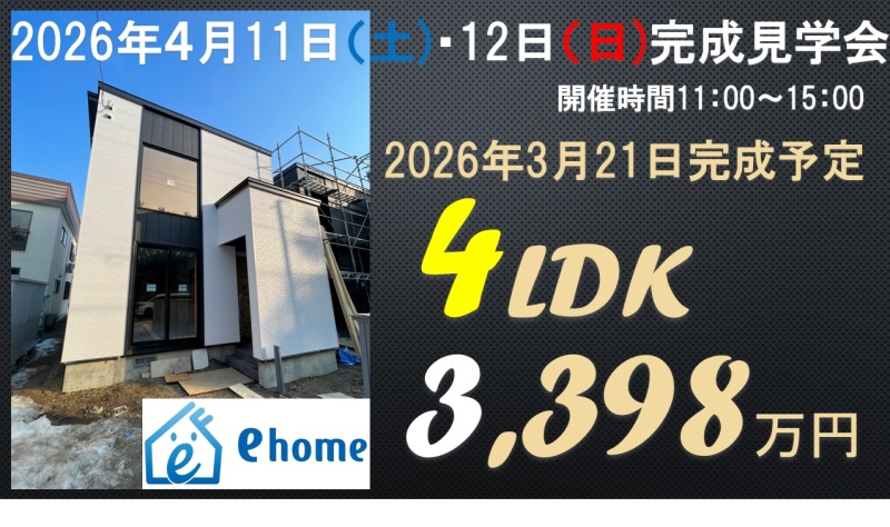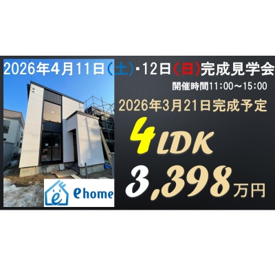 ここに注目!マイホームの夢を叶えるデザイン性の高い新築住宅がついに完成!気になっている方、もう見れます!3,398万円という魅力的な価格で、新生活をスタートできるチャンスです。月々のローン返済も無理なく計画でき、家計に優しいマイホームが実現します。 吹き抜けがある4LDKは、ご家族の笑顔が自然と広がるゆとりの空間。特に18帖のリビングキッチンは、カウンターキッチンや食器洗乾燥機付きシステムキッチンで、毎日のお料理が楽しくなりますね。ウォークインクローゼットやシューズボックスも完備しており、収納には困りません。 南西向きで日当たりも良好。お車は2台分駐車可能です。 認定こども園や小学校、中学校、スーパー、ドラッグストアなどが徒歩圏内に揃い、子育て世代にも大変嬉しい住環境です。 2026年4月11日(土)と12日(日)はオープンハウスも開催予定です。ぜひ一度、この新しいお住まいで始まる素敵な暮らしを体験しに来てください。オープンハウス前の内覧も随時受付しております!事前電話もしくはメールお問合せよりご予約で早朝7時~深夜22時まで可能です!柔軟な対応の弊社でぜひご内覧あれ!