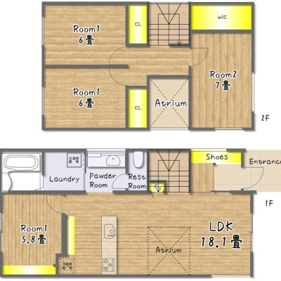 | 間取り | 4LDK1階:LDK18帖 洋室5.8帖 / 2階:洋室7帖 洋室6帖 洋室6帖 |