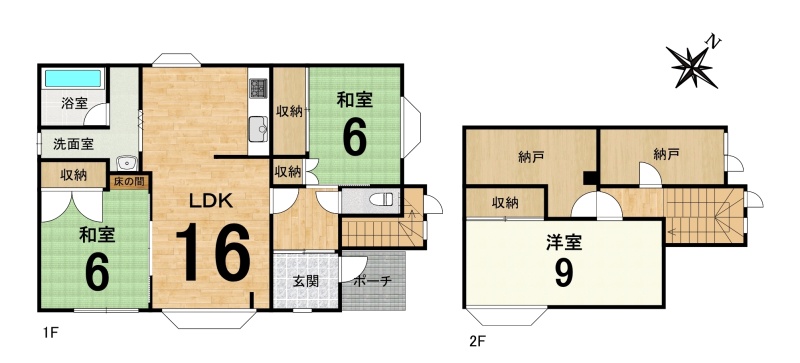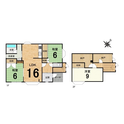 | 間取り | 3SLDK1階:和室6帖 和室6帖 LDK16帖 / 2階:洋室9帖 |