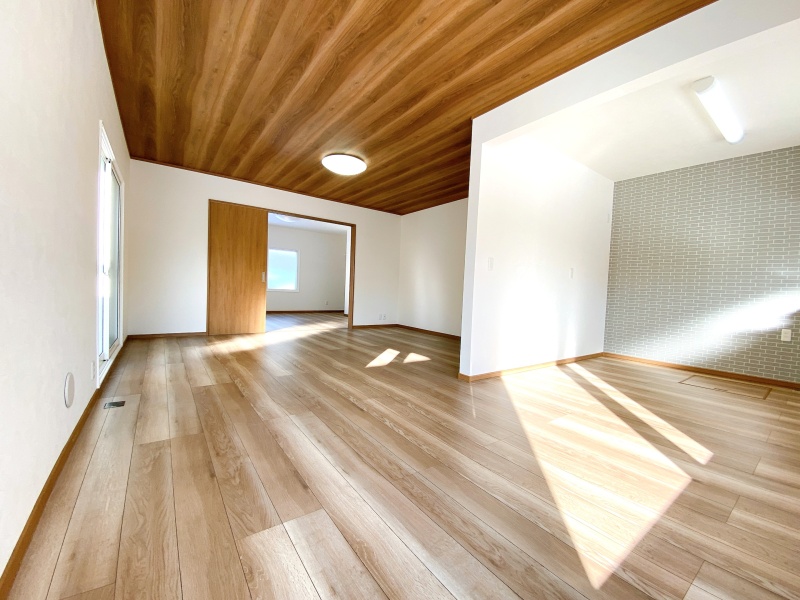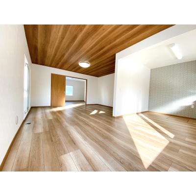 1階リビングの天井クロスは木目でおしゃれです♪