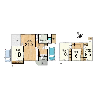 | 間取り | 4LDK1階:LDK21.9帖 洋室10帖 / 2階:洋室10帖 洋室6帖 洋室8.5帖 |