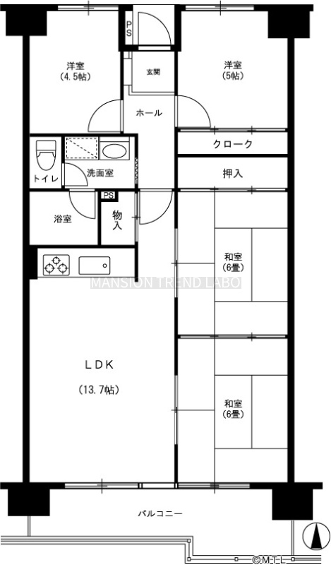 南向き5階部分住戸!バランスの取れた間取形成の4DKタイプ!専有面積74.2㎡!