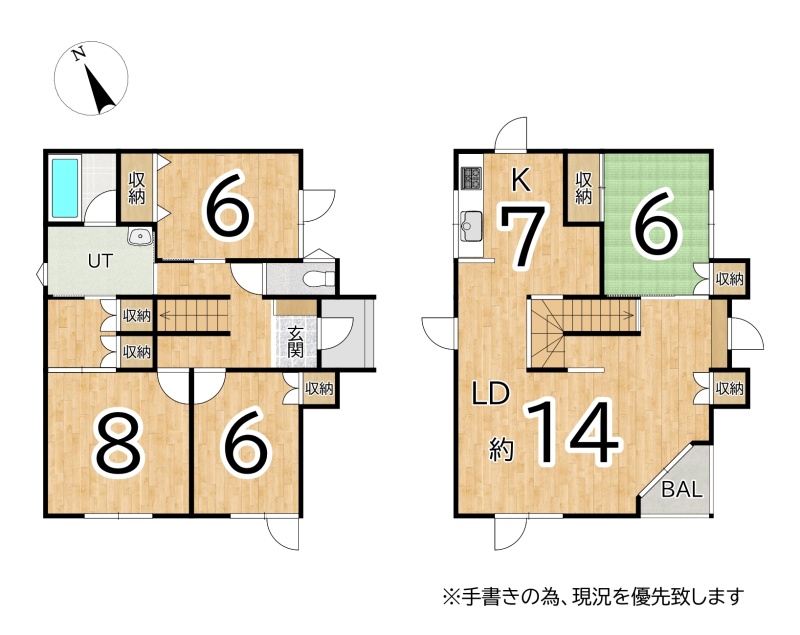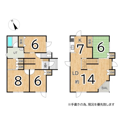 | 間取り | 4LDK1階:洋室8帖 洋室6帖 洋室6帖 / 2階:LDK21帖 和室6帖 |