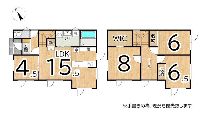 | 間取り | 4LDK1階:LDK15.5帖 洋室4.5帖 / 2階:洋室8帖 洋室6帖 洋室6.5帖 |