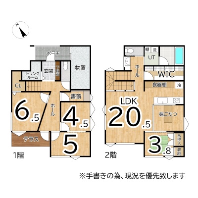 | 間取り | 3LDK1階:洋室6.5帖 洋室9.5帖 / 2階:LDK20.5帖 洋室3.8帖 |