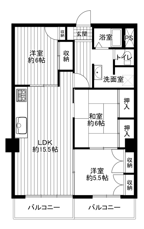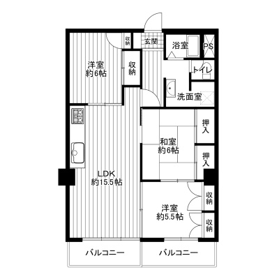 3LDK(74.4m²)└ 洋室6帖 洋室5.5帖 和室6帖 LDK15.5帖