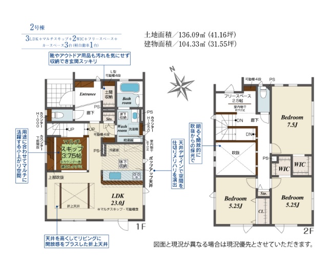 | 間取り | 3LDK1階:LDK23帖 / 2階:洋室7.5帖 洋室5.25帖 洋室5.25帖 |