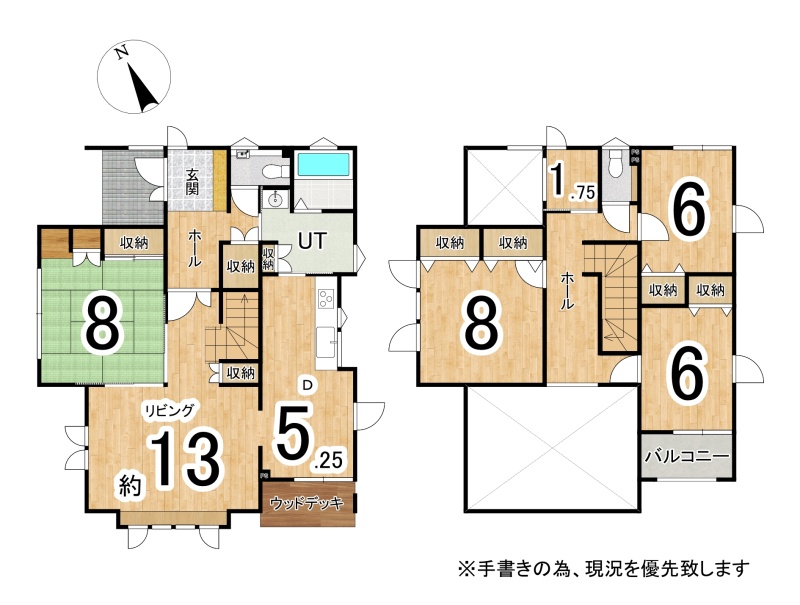 | 間取り | 4SLDK1階:L13帖 D5.25帖 和室8帖 / 2階:洋室8帖 洋室6帖 洋室6帖 S1.75帖 |