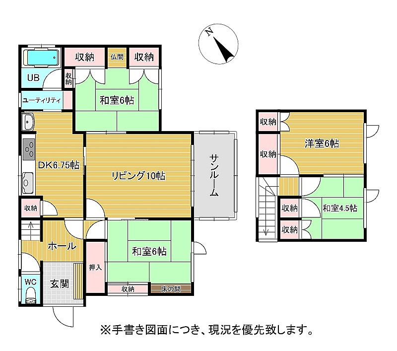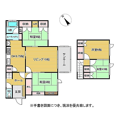 | 間取り | 4LDK1階:L10帖 DK6.75帖 和室6帖 和室6帖 / 2階:洋室6帖 和室4.5帖 |