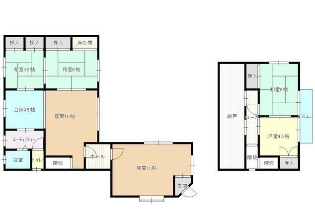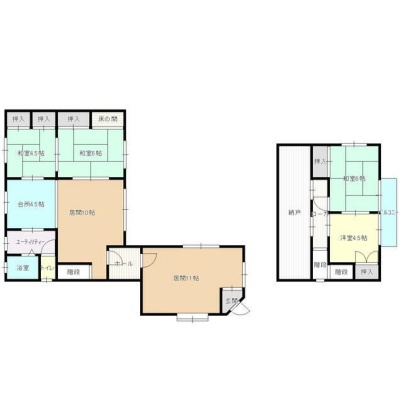 | 間取り | 5LDK1階:洋室11帖 和室6帖 和室4.5帖 / 2階:LDK14.5帖 和室6帖 洋室4.5帖 |