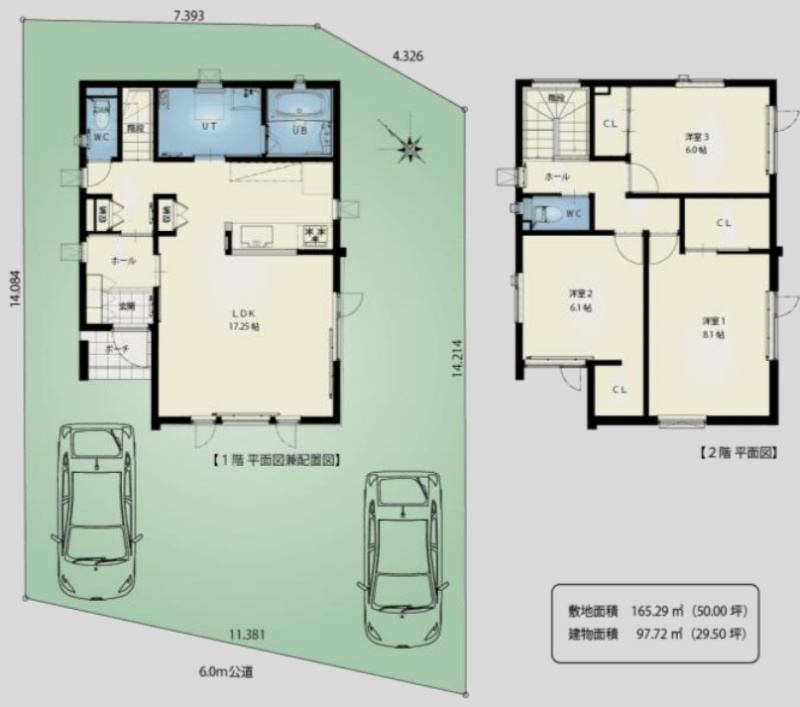 | 間取り | 1階:LDK17.25帖 / 2階:洋室8.1帖 洋室6.1帖 洋室6帖 |