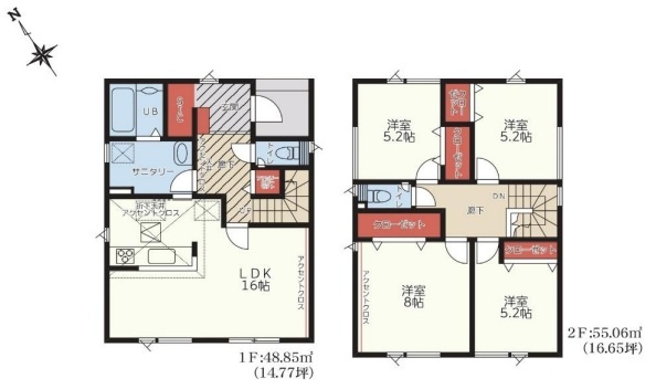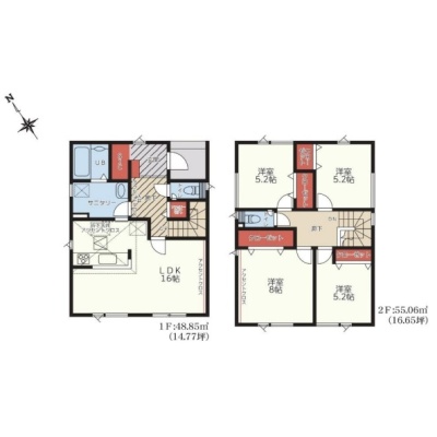 | 間取り | 4LDK1階:LDK16帖 / 2階:洋室8帖 洋室5.2帖 洋室5.2帖 洋室5.2帖 |